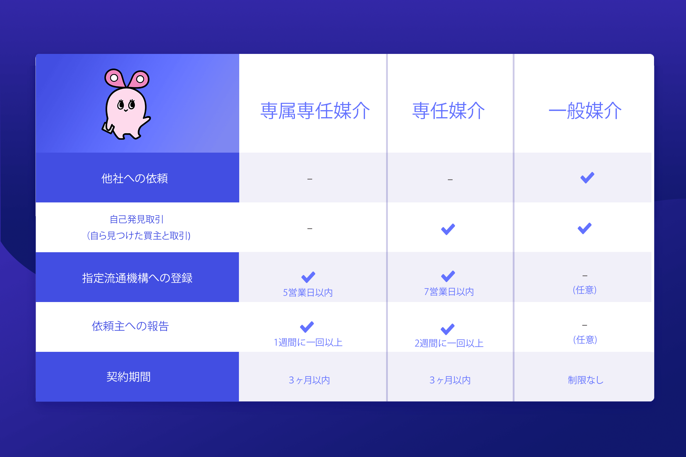 媒介契約には「専属専任媒介契約」「専任媒介契約」「一般媒介契約」の3種類があり、契約前にそれぞれの違いをご説明いたします。